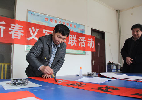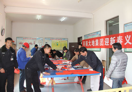 (本报讯)2月10日上午,农历甲午年腊月二十二,大地公司中控办公楼一楼烧成车间会议室内,翰墨飘香,欢声笑语,大地集团在这里隆重举行迎新春义写春联活动。 在传统乙未年农历新春佳节到来前夕,大地集团在妥善安排好职工年货的基础上,非常重视企业文化建设,邀请部分国家级和省级书法家协会会员到集团开展义写春联活动,活跃企业文化,营造新春气氛。此前,集团提前安排专人购买了笔墨纸砚和红纸,并结合企业发展现状,拟写了部分喜庆、新颖、励志、接地气的新春楹联内容,使职工在欢度新春佳节的同时,提振士气,爱岗敬业,立足岗位做贡献。 义写活动现场 书法家正在聚精会神地书写春联 |