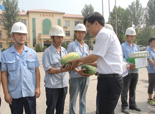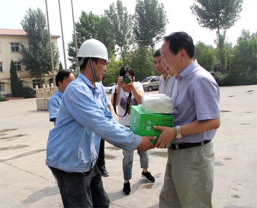 7月13日上午,在县总工会主席郭鹏飞的带领下,县总工会“夏送清凉”活动组一行来到大地公司,送来了西瓜、矿泉水、绿茶、毛巾等防暑降温用品,县委常委、宣传部长李庆豪,集团总裁崔泉发等领导参加活动。 丝丝清凉,浓浓情谊。县总工会“夏送清凉”活动为大地公司职工送来亲切的慰问和夏日的清凉,让广大职工感受到了党和政府的关爱,从而鼓舞了员工士气,激发了员工的工作热情。大家纷纷表示,要提振信心,奋战酷暑,确保顺利完成各项目标任务,为企业的发展作出积极的贡献。 县委常委、宣传部长李庆豪为一线员工发放慰问品 县总工会主席郭鹏飞为一线员工发放慰问品 一份份包含深情厚意的慰问品,让职工们乐开了怀