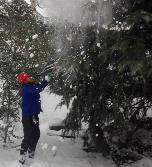 纷纷扬扬的雪花,把整个大地裹得严严实实,室外温度降到零下10度左右,虽然天气非常寒冷,但丝毫阻挡不住大地员工工作的热情。为了大家出行方便,为了保护树木不受伤害,各部门自发组织清扫积雪,特别是生产一线员工,在搞好检修工作的同时,积极组织清理积雪,做到检修清雪两不误。在冰冷的美景之下,一个个热火朝天的场面、一个个忙忙碌碌的身影、一张张朴实灿烂的笑脸,成为这雪天里最美的风景线。