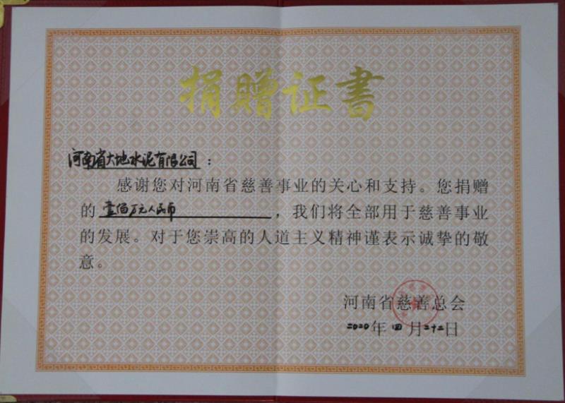 河南省大地水泥有限公司向河南省慈善总会捐款100万元